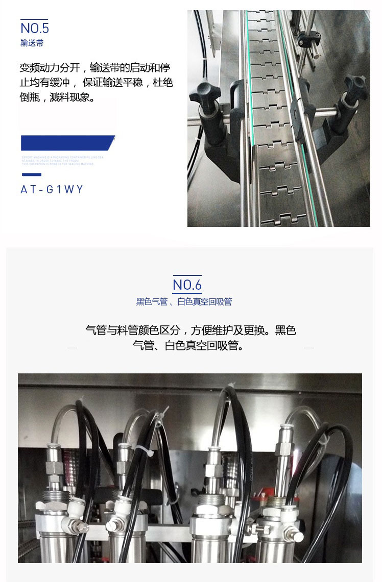 該六頭柱塞式全自動(dòng)潤滑油灌裝機(jī)特的灌裝頭設(shè)計(jì)及真空回吸系統(tǒng),確保灌裝過程無殘油滴漏,快慢雙速灌裝,灌裝速度可調(diào),杜絕溢瓶現(xiàn)象。該機(jī)采用動(dòng)力灌裝,無需配裝高位罐,簡化了安裝工序,提高了灌裝效率。履帶式壓蓋機(jī),穩(wěn)定無噪音,無空壓現(xiàn)象。觸摸屏界面友好,操作簡捷,SIEMENS PLC控制系統(tǒng),運(yùn)算速度快,性能穩(wěn)定,品質(zhì)卓越。電、氣件均采用精品元件,確保整機(jī)運(yùn)作穩(wěn)定。