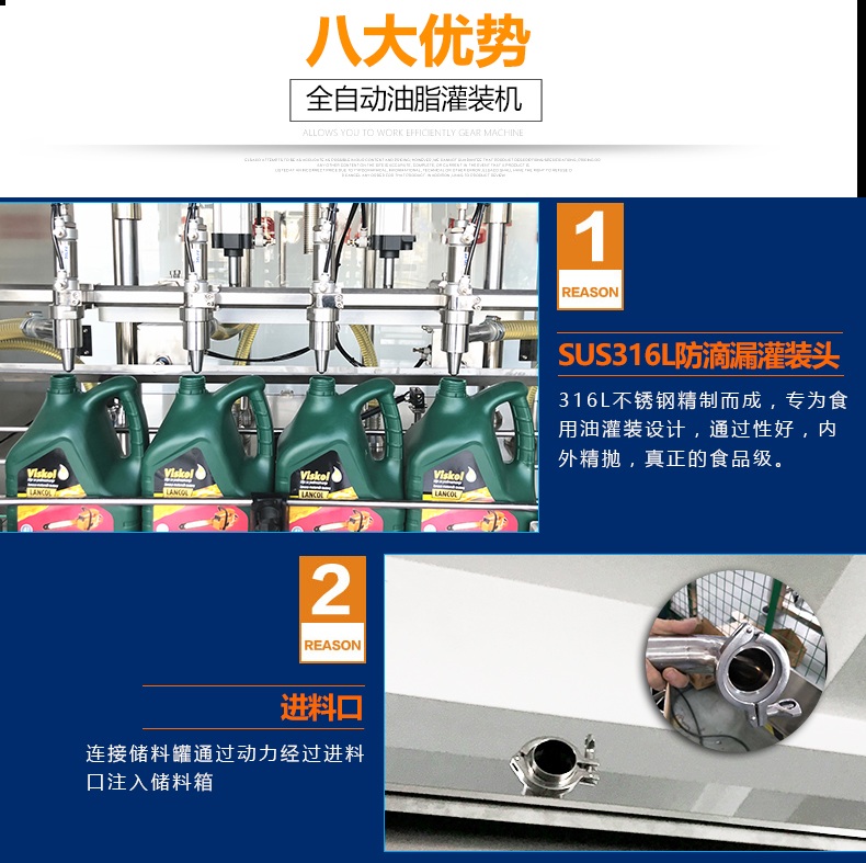 1.防滴漏灌裝頭由SUS316L不銹鋼精制而成,專(zhuān)為食用油灌裝設(shè)計(jì),通過(guò)性好,內(nèi)外精拋,真正的食品級(jí).