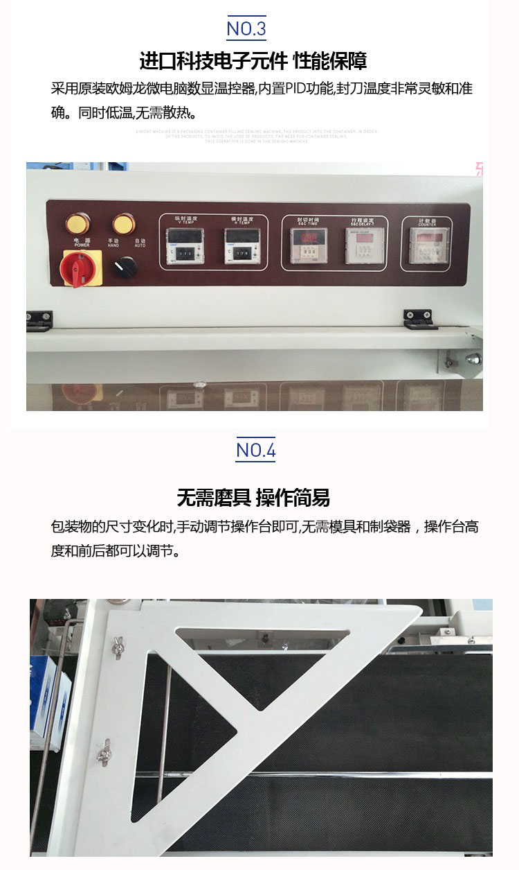 采用國(guó)際先進(jìn)控制元件;封刀采用特殊設(shè)計(jì),封口牢固、不開裂、不粘刀;