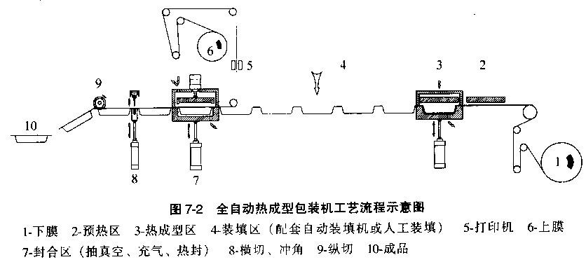 如下圖所示是全自動(dòng)熱成型包裝機(jī)的包裝工藝流程示意圖。整機(jī)采用連續(xù)步進(jìn)的方式,由下卷膜成型, 上卷膜作封口。